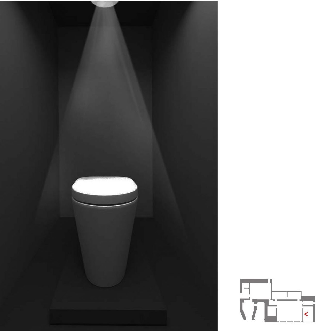 進廁所可遵循三個角落的小孔透光來發現廁所的門,使得進門前就有心境上的轉折;進門後發現四周灰牆包圍之中只有一座墊高的馬桶/ 小便斗在正中央,周圍無物,同時會發現在設備的正上方天花板有開一個洞使得陽光可以直接照射於設備上。